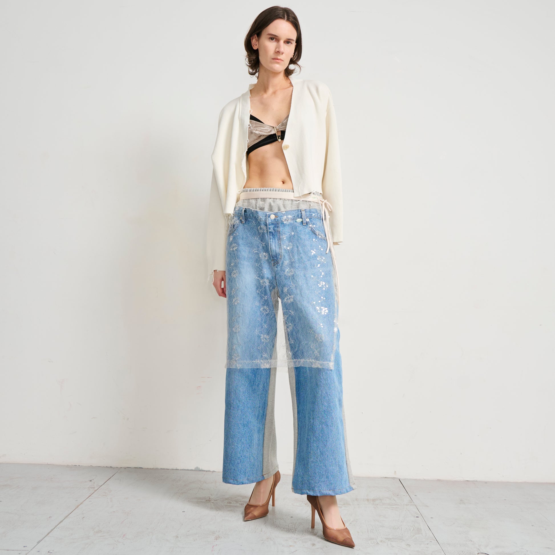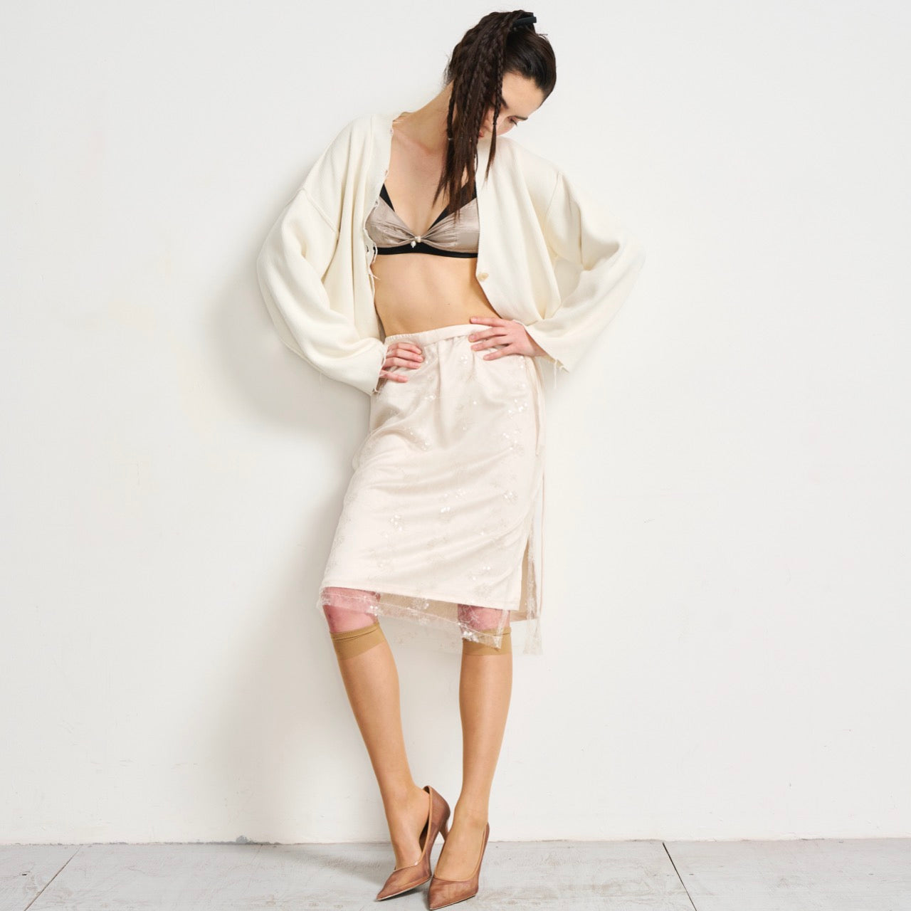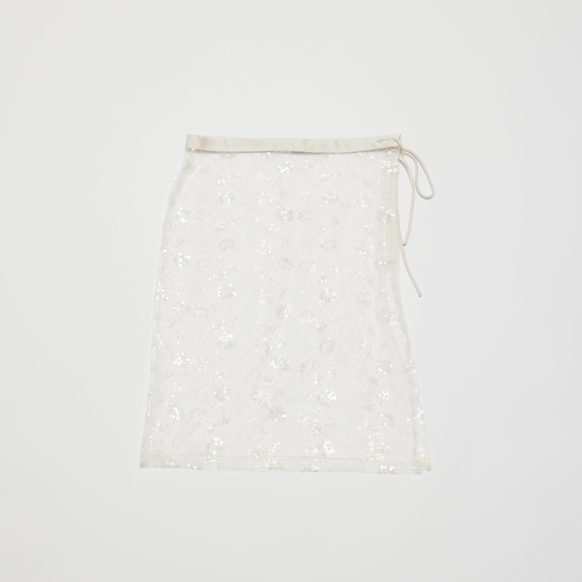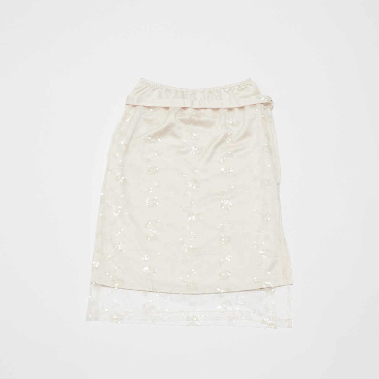 Sheer embroidered skirt with a hidden zipper back closure on the side comes with a detachable lining skirt.