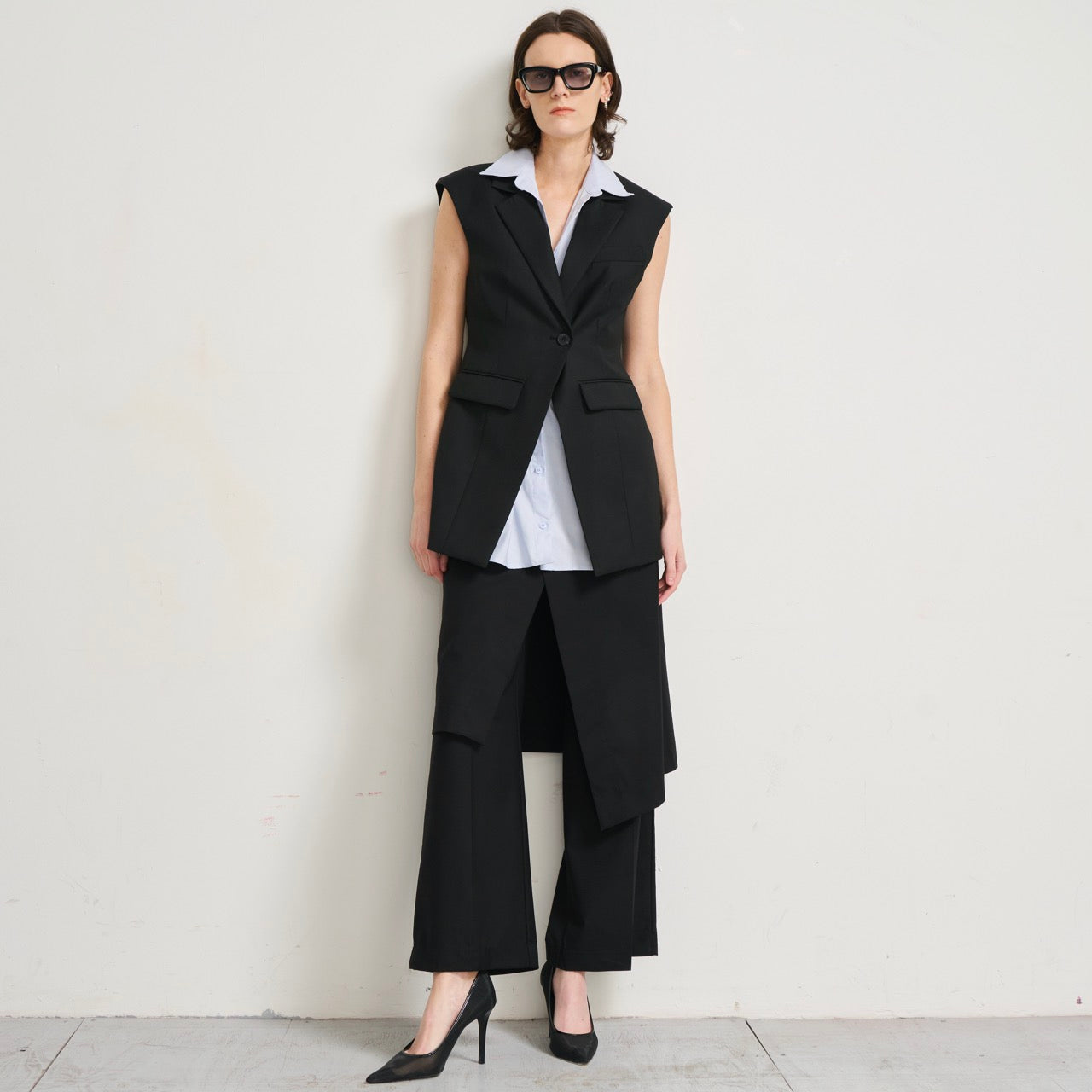 Fitted long sleeveless vest with a detachable halter neck blue button down shirt.