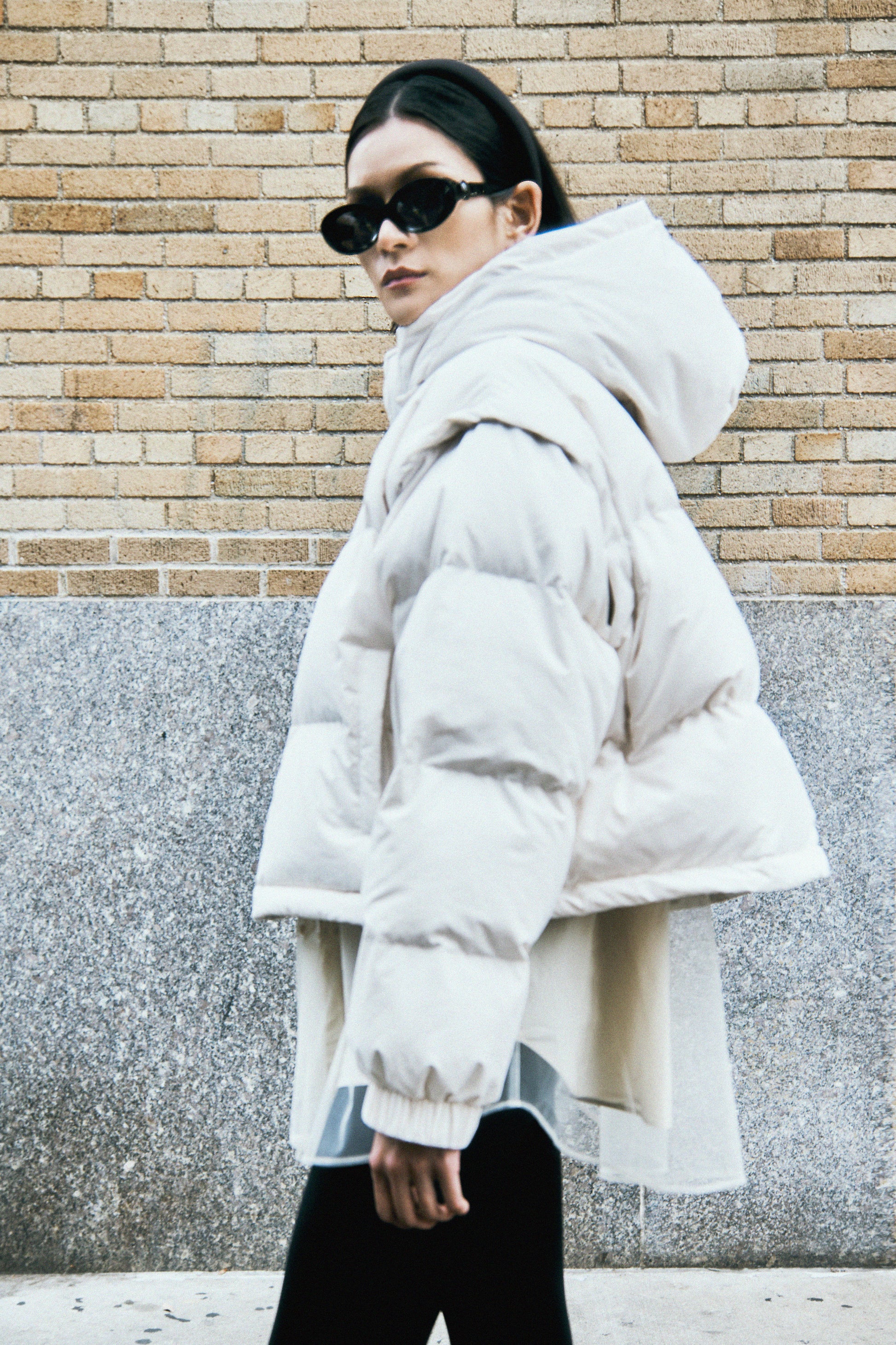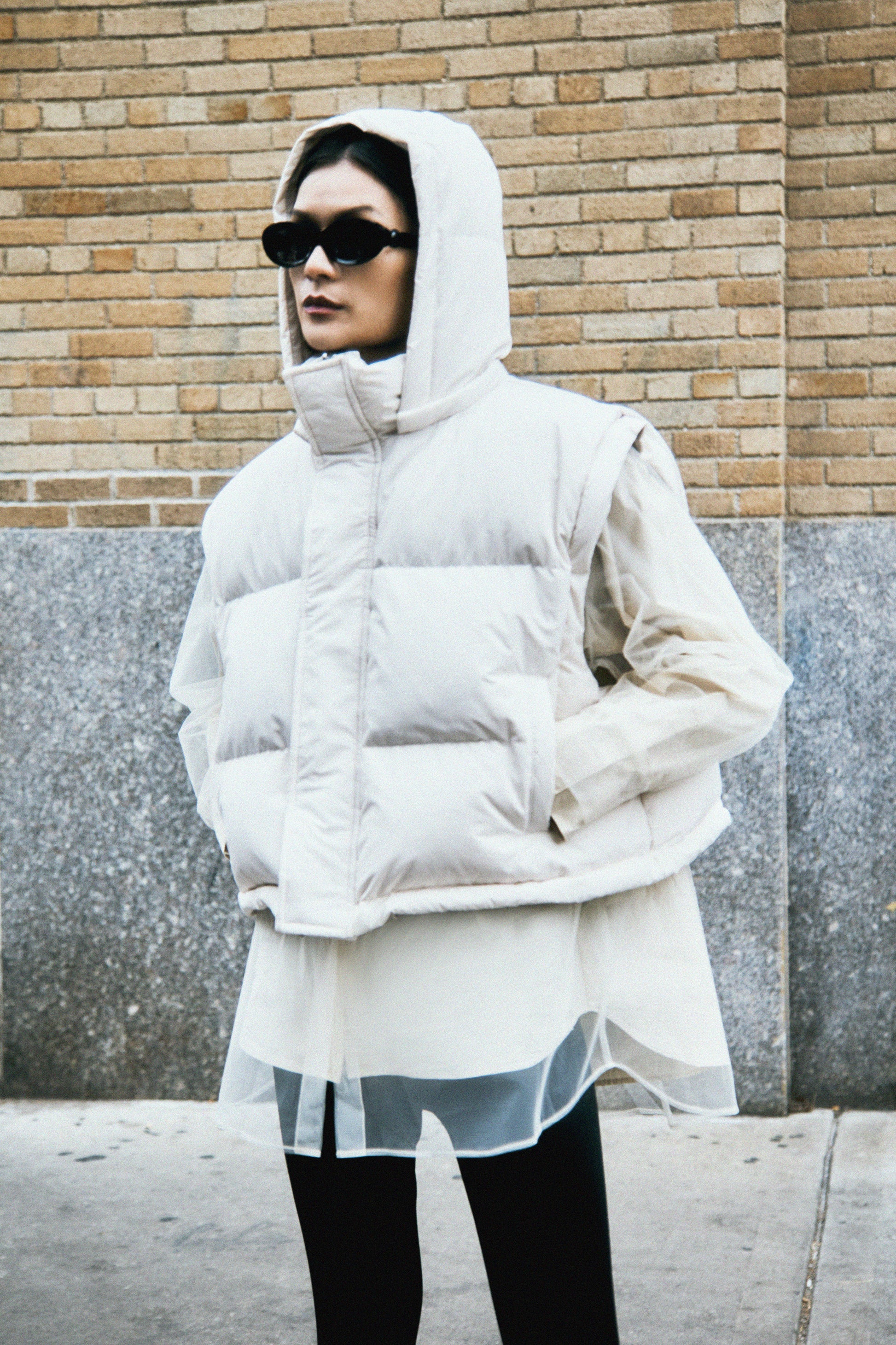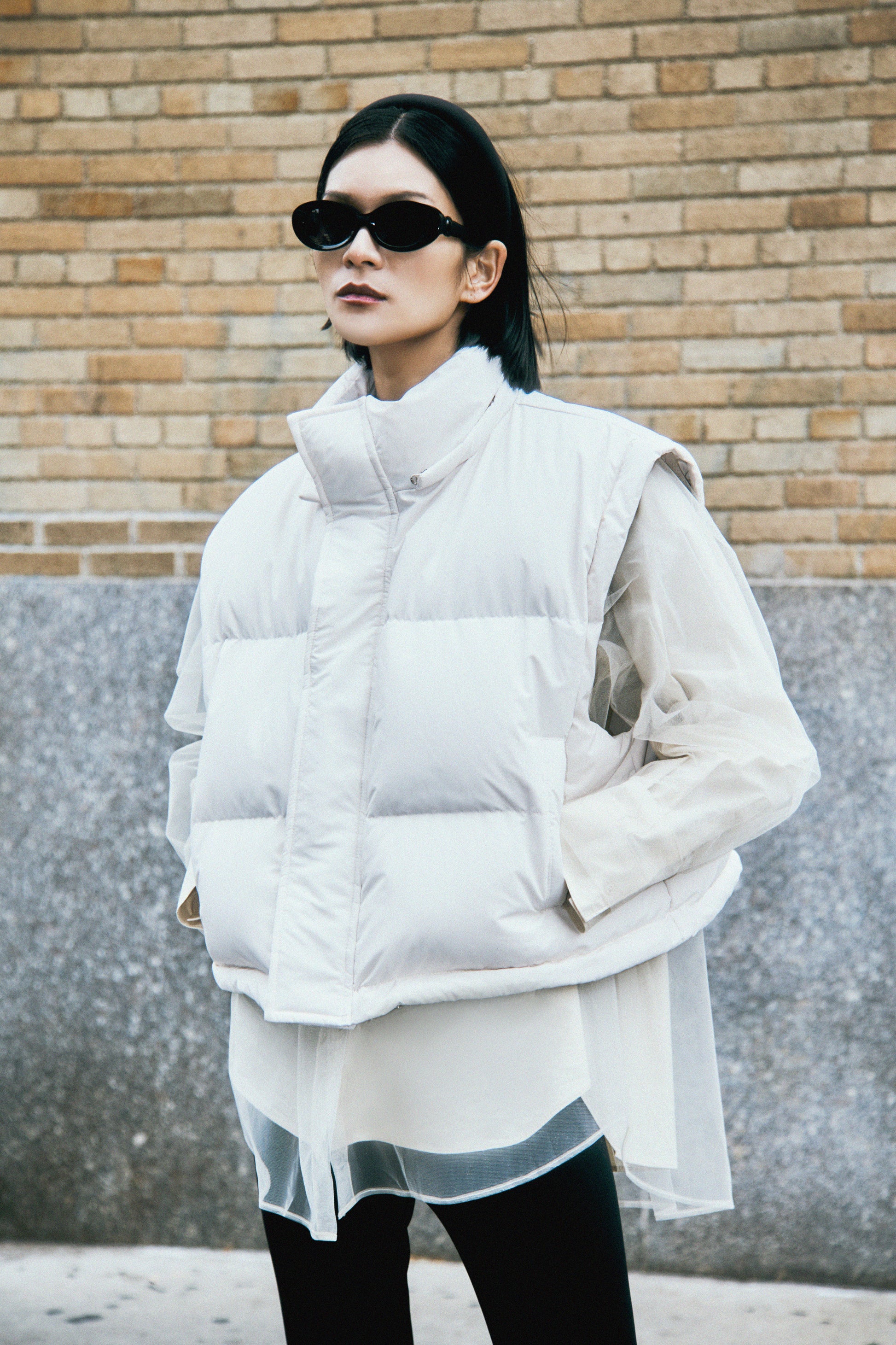 100% goose jacket can be worn in versatile styles. Reversible, Zip off the sleeves and hoods and transform it to the vest. Light weight, insulated to regulate body temperature.