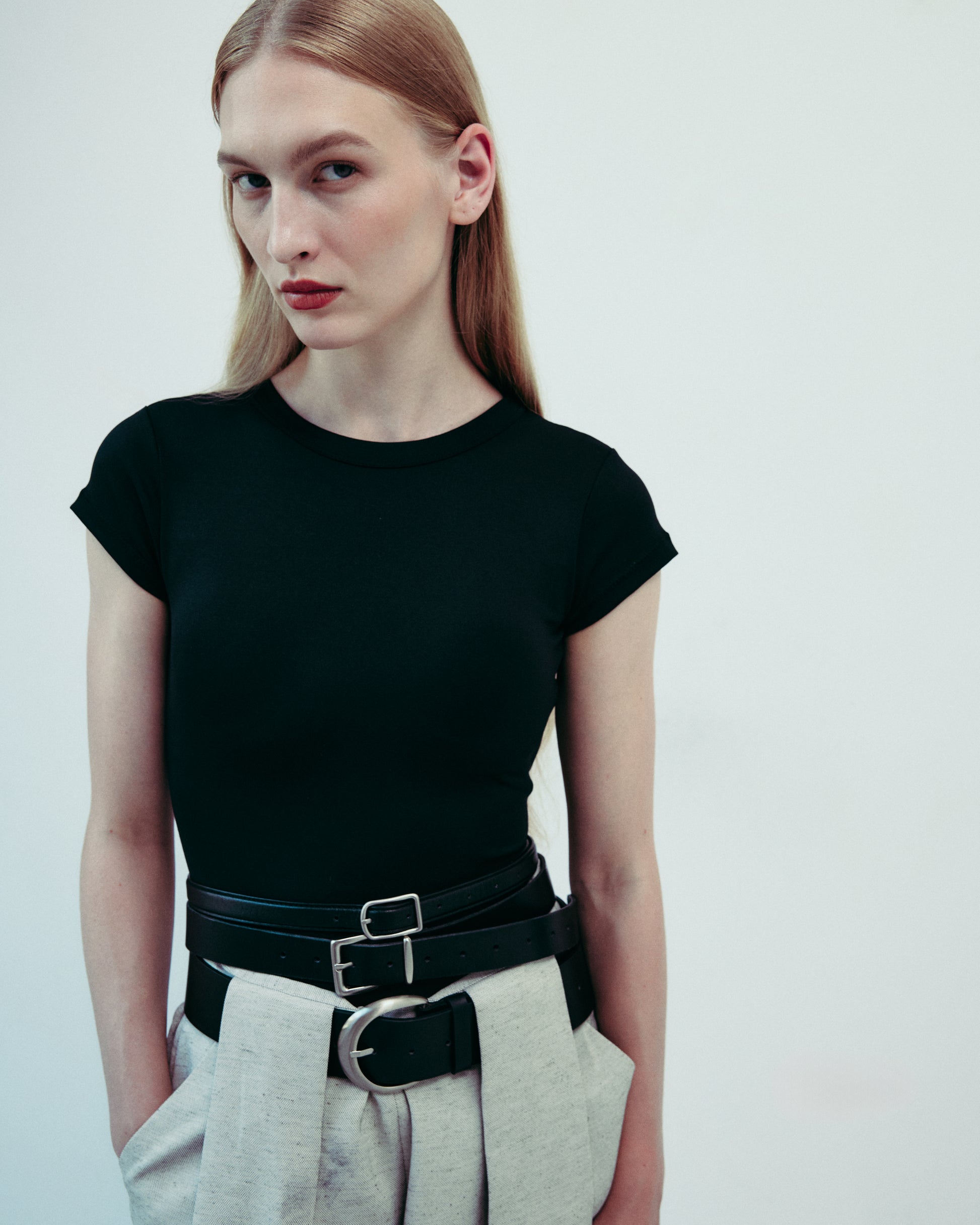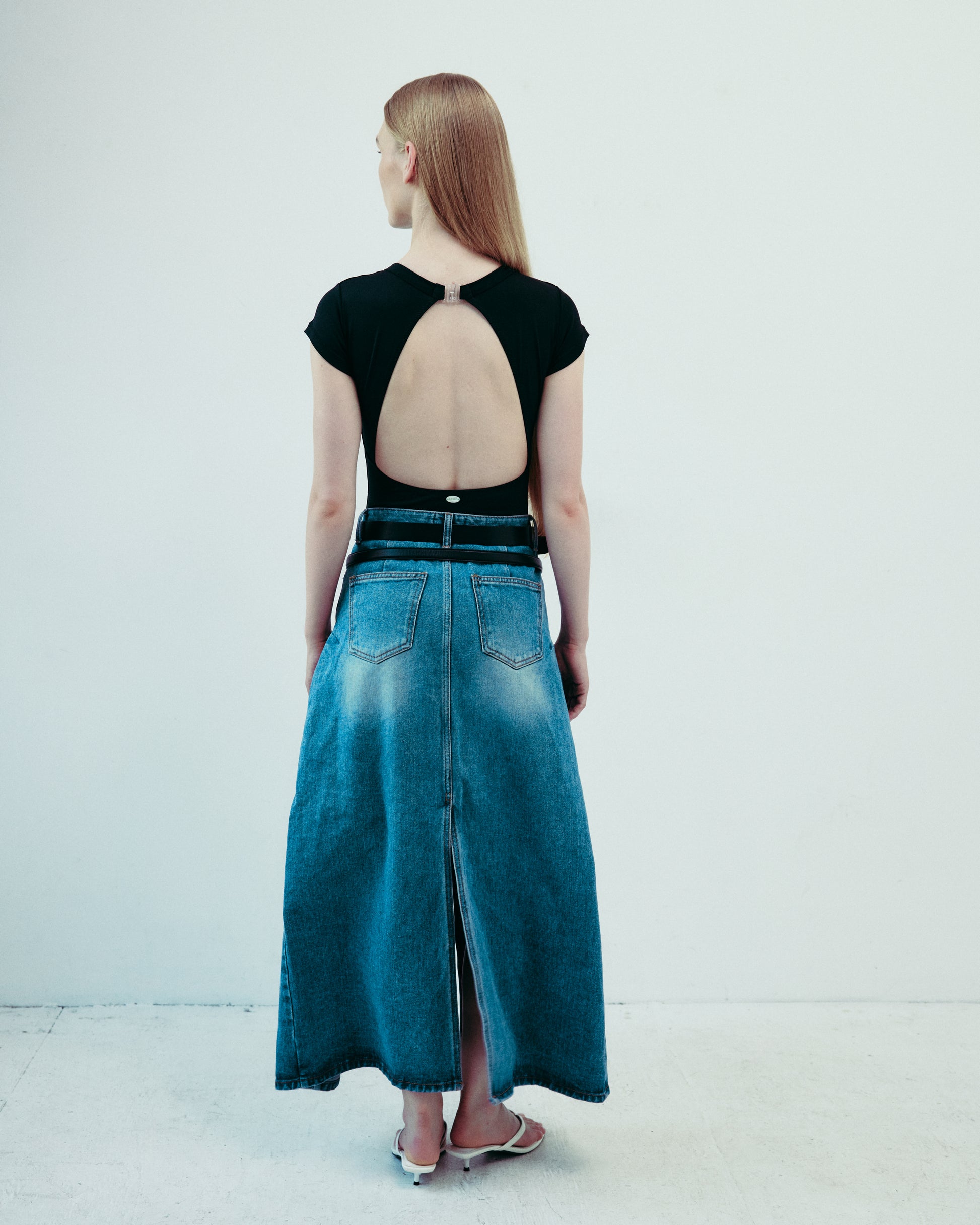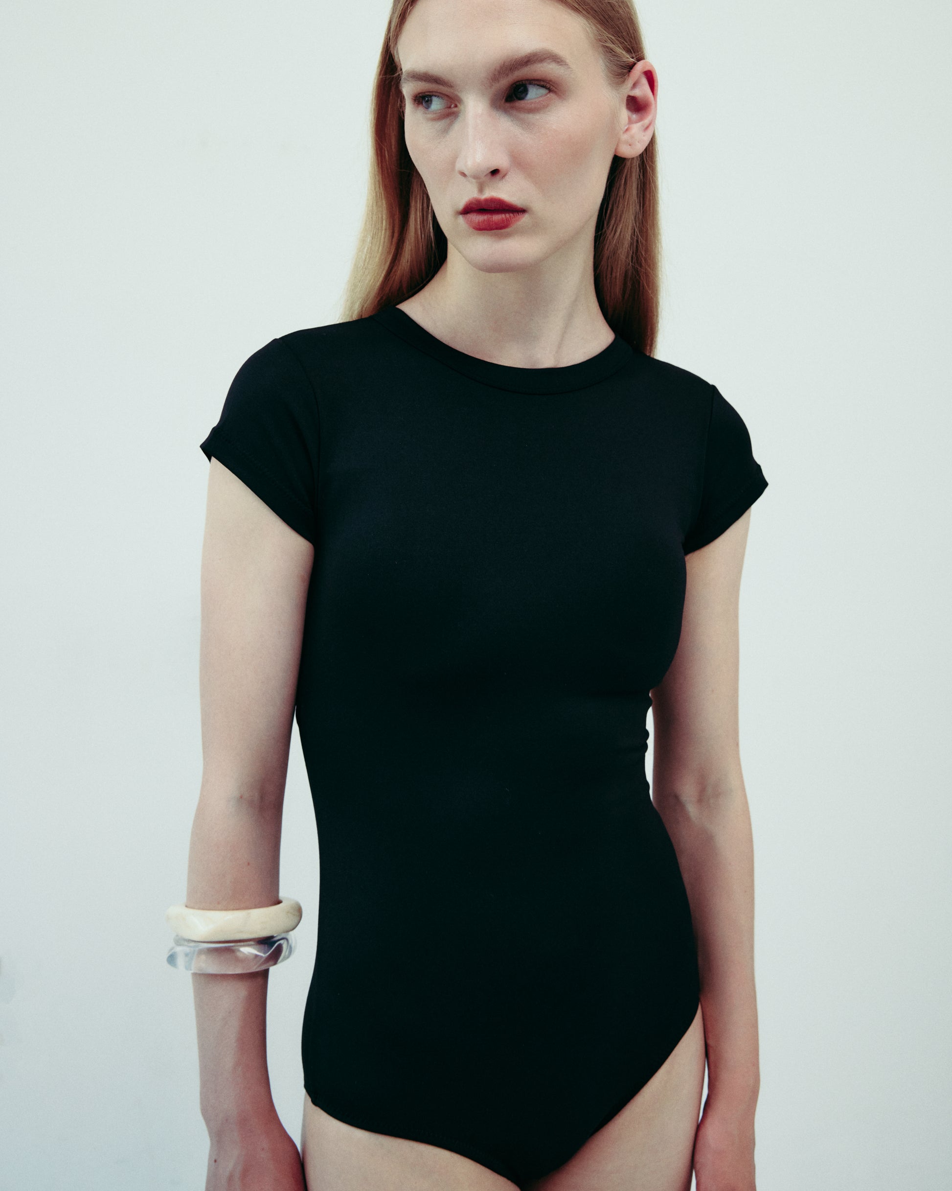 A minimalist essential with a sleek silhouette — this black one-piece swimwear features a structured square neckline, thin shoulder straps, and a bold scoop back for a striking contrast. Made from a smooth, high-stretch fabric, it contours the body like a second skin, offering support and shape without extra fuss. High-cut at the leg for an elongated look, it transitions seamlessly from poolside to streetwear. Style it as a swimsuit or layer it as a bodysuit under trousers, skirts, or sheer dresses — this piece does it all.