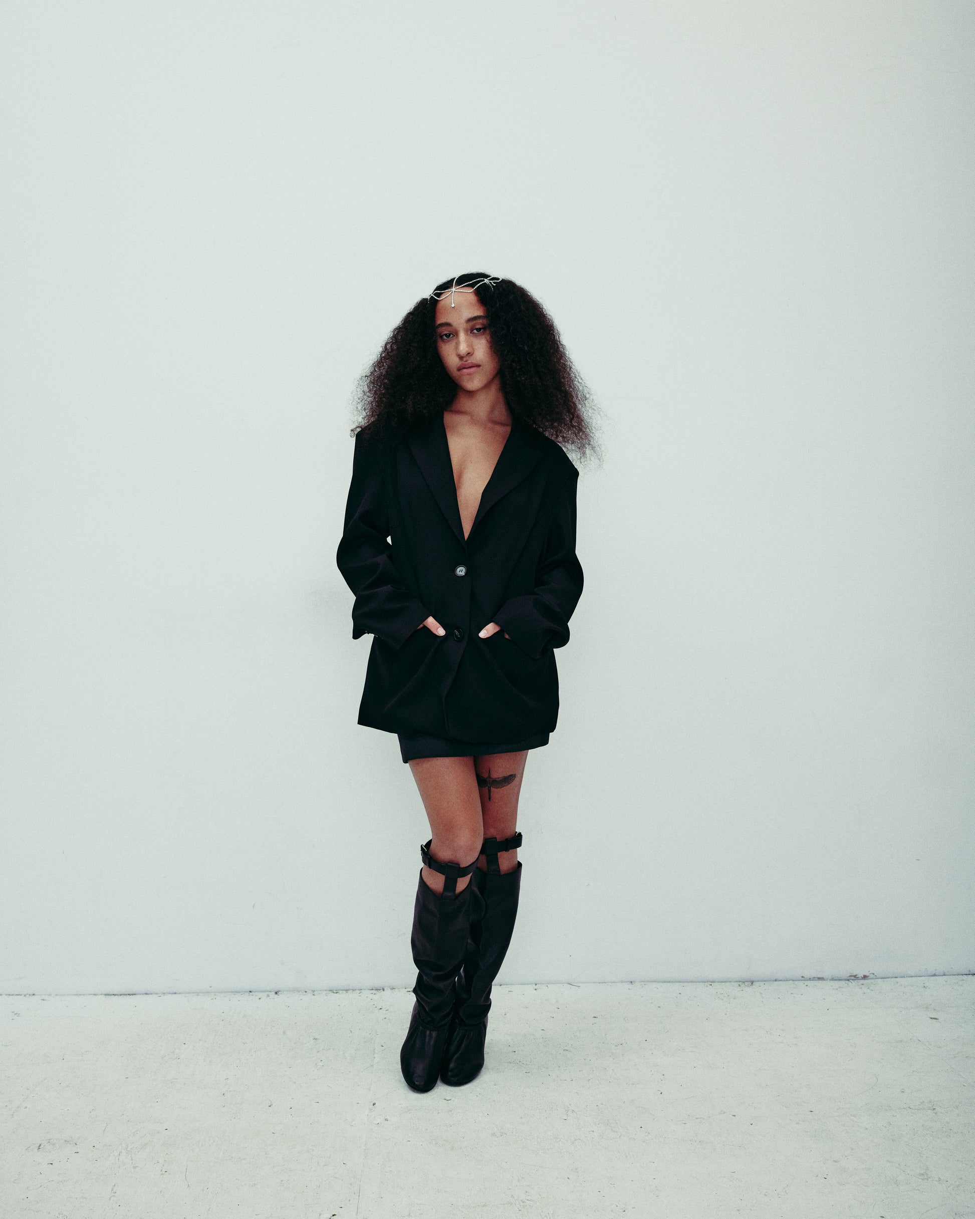 This edgy black micro mini skirt makes a bold statement with its unique layered design, appearing as if two separate skirts are artfully combined. The ultra-short length emphasizes a daring and playful vibe. Adding a touch of industrial chic, the skirt features two functional zip-up closures in the back, providing both a secure fit and a distinctive visual detail. This layered micro mini is perfect for creating high-impact looks with a rebellious edge.