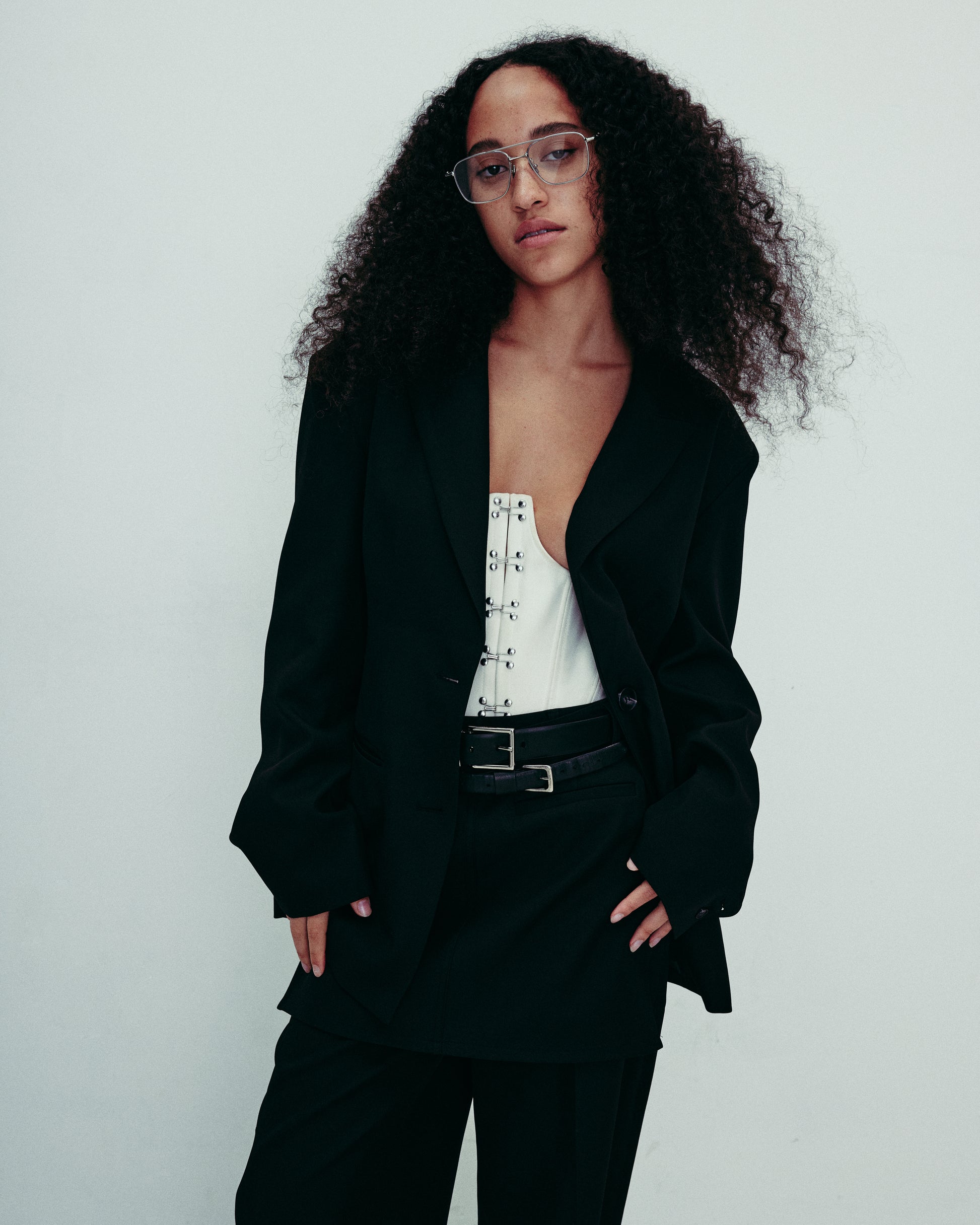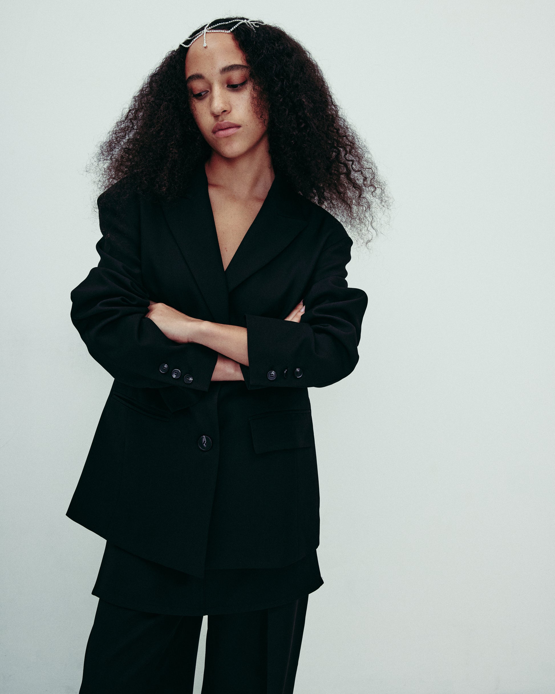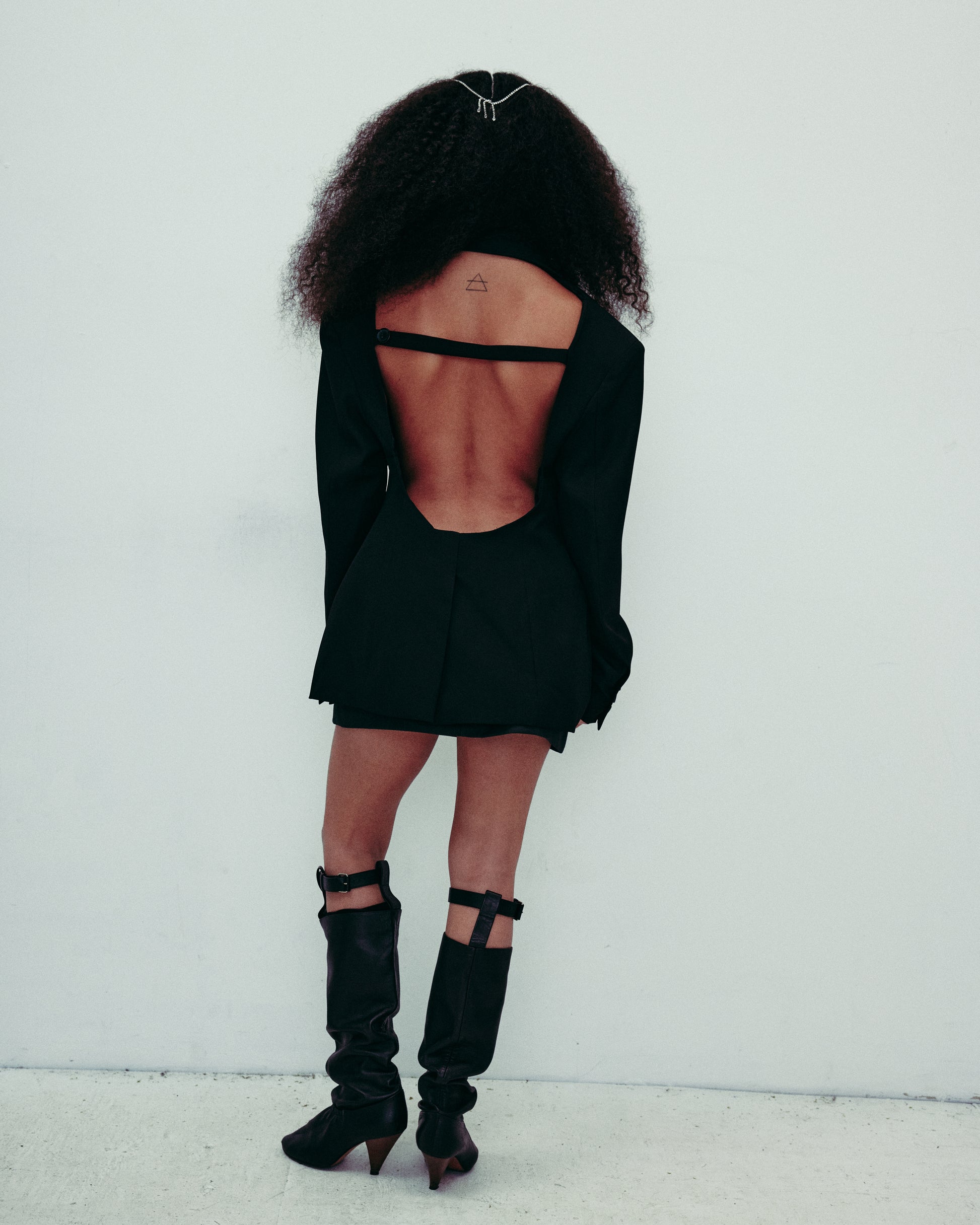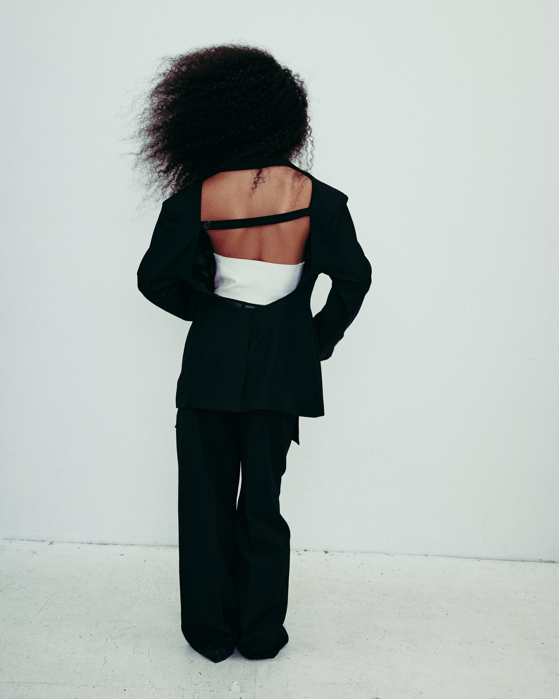 This flare-fit open-back blazer elevates a classic silhouette with a daring and stylish twist. Crafted for a flattering shape, it gently broadens towards the hem, creating a sophisticated and modern look. The defining feature is the striking open back, artfully detailed with a chic strap that adds an unexpected element of allure and visual interest. Practicality meets style with a convenient pocket, seamlessly integrated into the design. The front is kept clean and tailored with a two-button closure, ensuring a polished and secure fit. This blazer is the perfect statement piece to add a touch of edgy sophistication to any ensemble.
