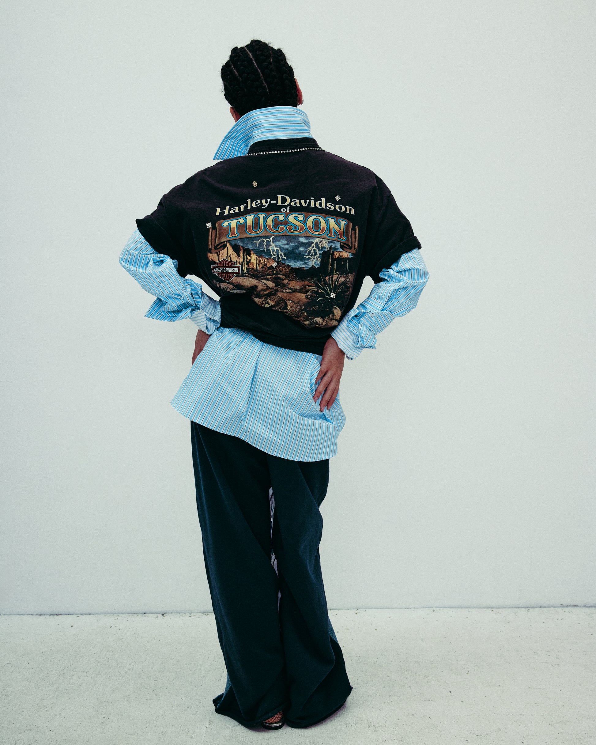 This is a truly one-of-a-kind vintage Harley-Davidson t-shirt, radiating a rebellious and luxurious spirit. Carefully reworked, it showcases unique Swarovski embroidery details that catch the light and elevate the iconic graphic with unexpected sparkle. Adding to its edgy character are intentional ripped details, lending a perfectly worn-in and individualistic feel. For added versatility and a dose of cool contrast, the t-shirt comes with detachable oversized waffle-knit long sleeves, allowing you to transform its look and adapt to different temperatures. This statement piece is a wearable piece of history, infused with high-fashion embellishments and a distinctive, do-it-yourself attitude.