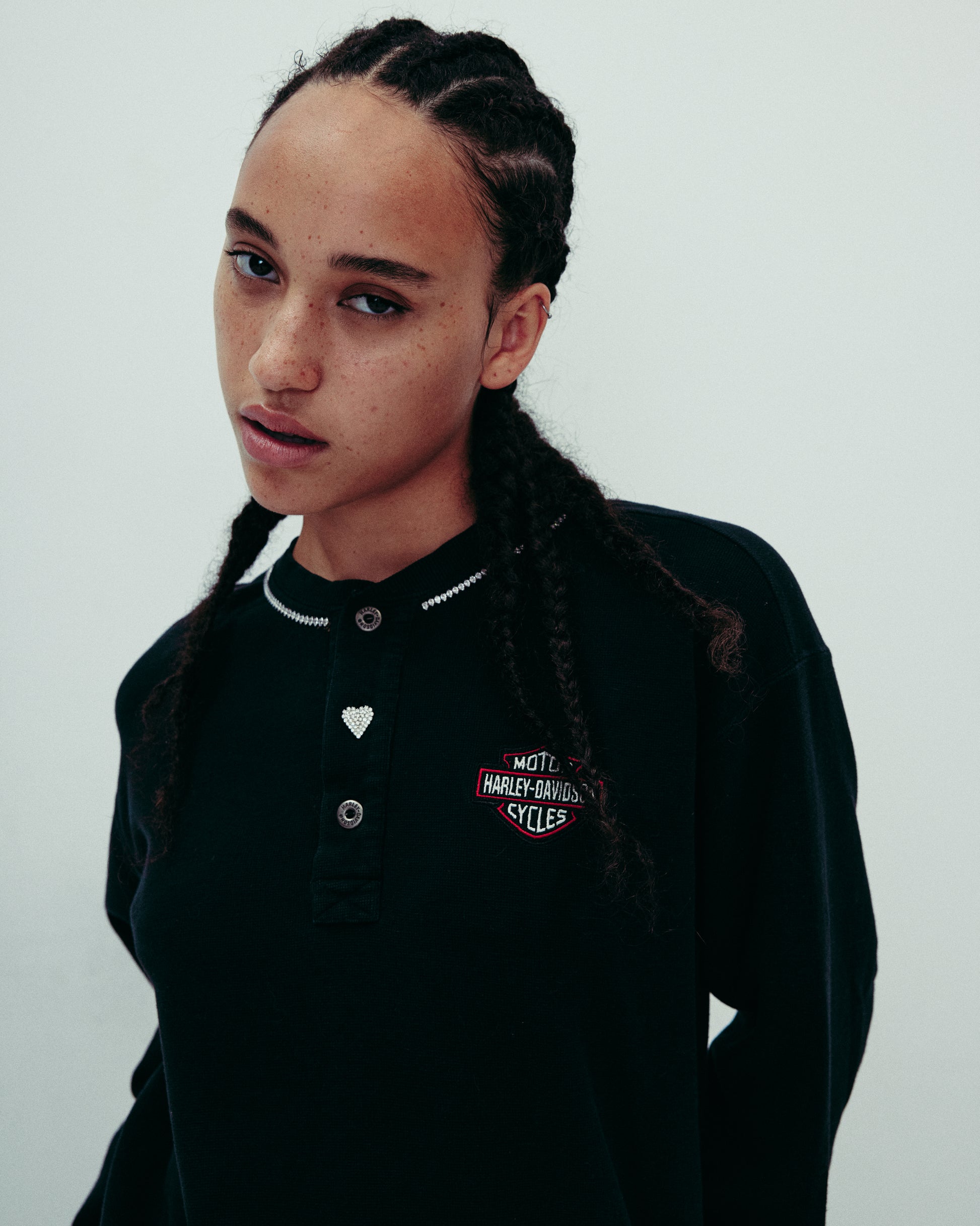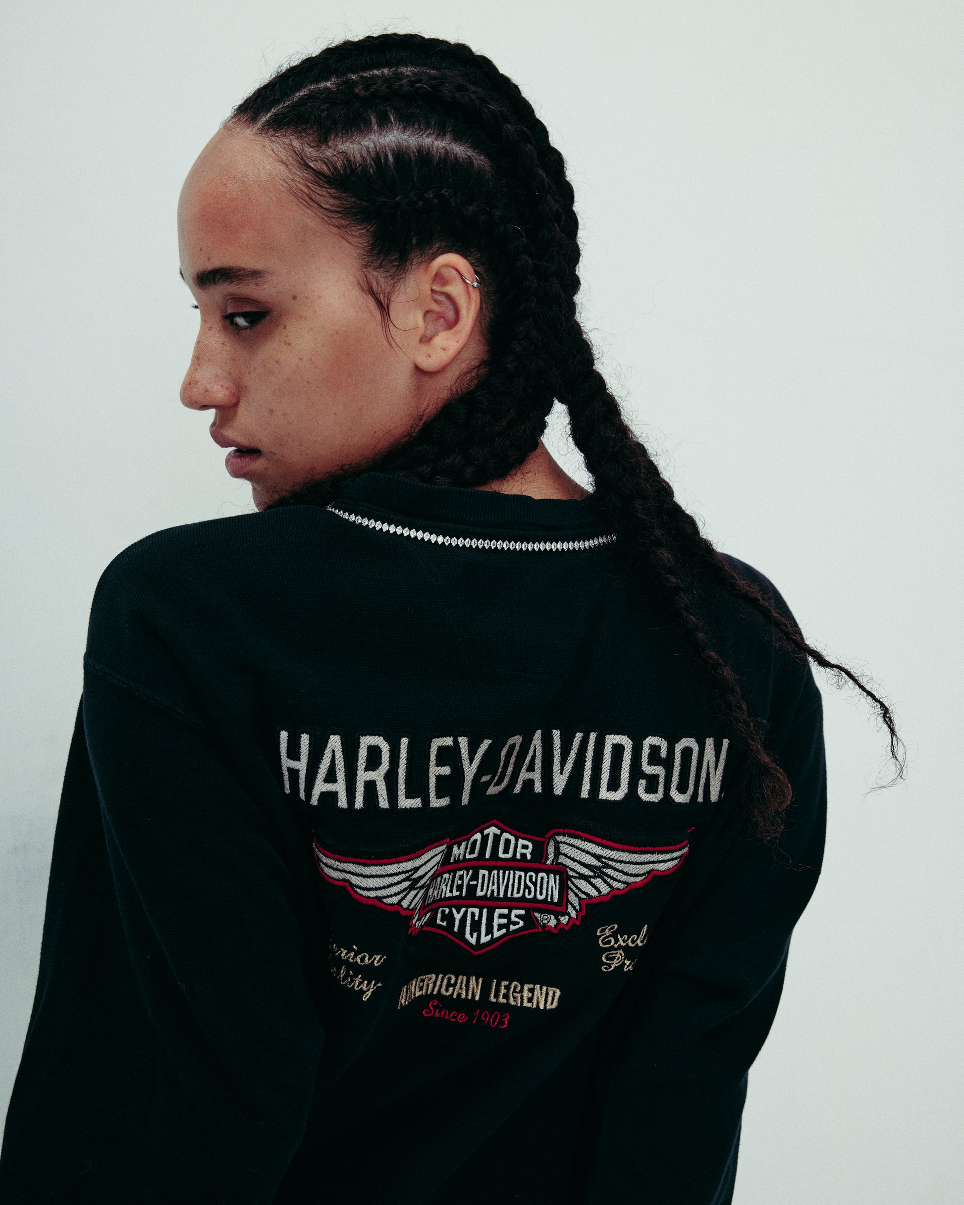 This is a truly one-of-a-kind vintage Harley-Davidson t-shirt, infused with a unique blend of rugged history and dazzling detail. This reworked piece features exquisite Swarovski embroidery details, adding a touch of unexpected luxury and sparkle to the iconic graphic. Intentional ripped details enhance its authentic vintage character and rebellious edge. The design cleverly combines the comfort of long sleeves in a waffle-knit fabric with the sporty aesthetic of a baseball t-shirt style. This singular creation offers a bold and stylish way to showcase your individuality, blending a classic American icon with high-fashion embellishments and a distinctive design.