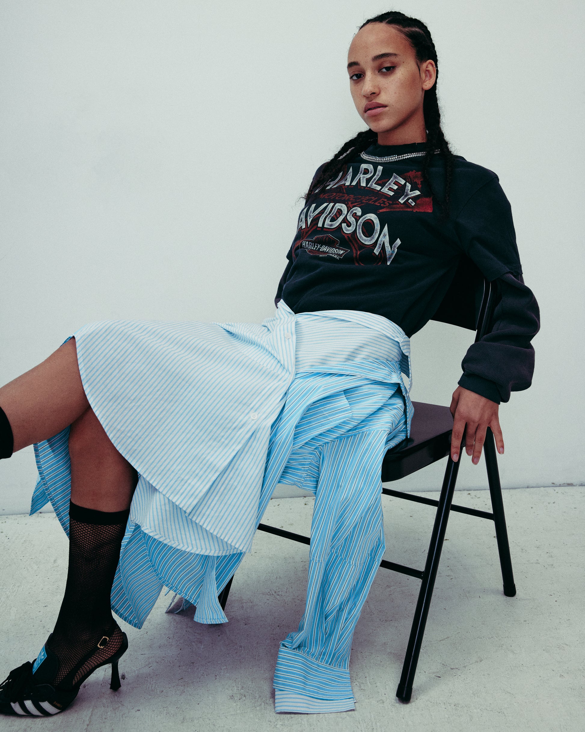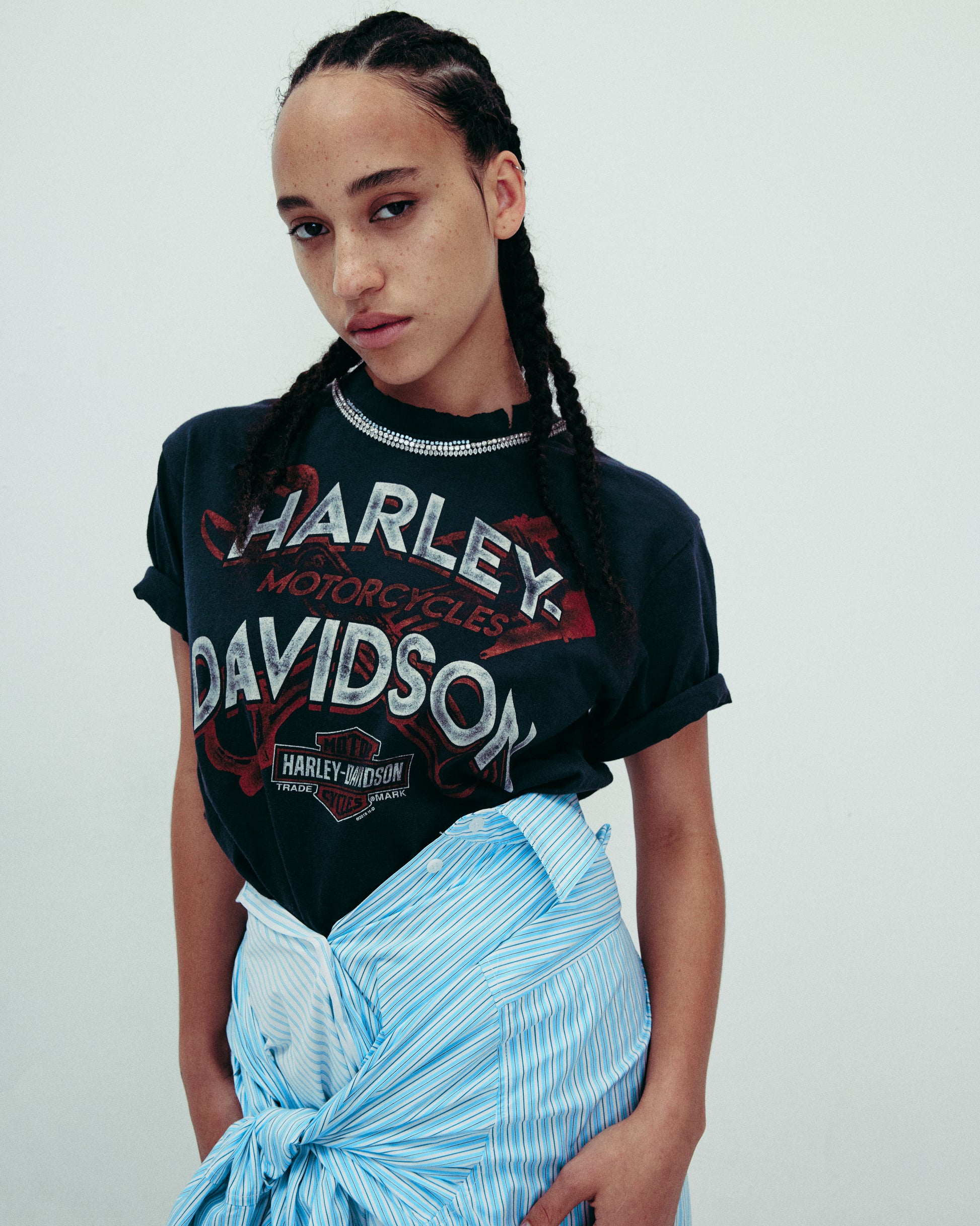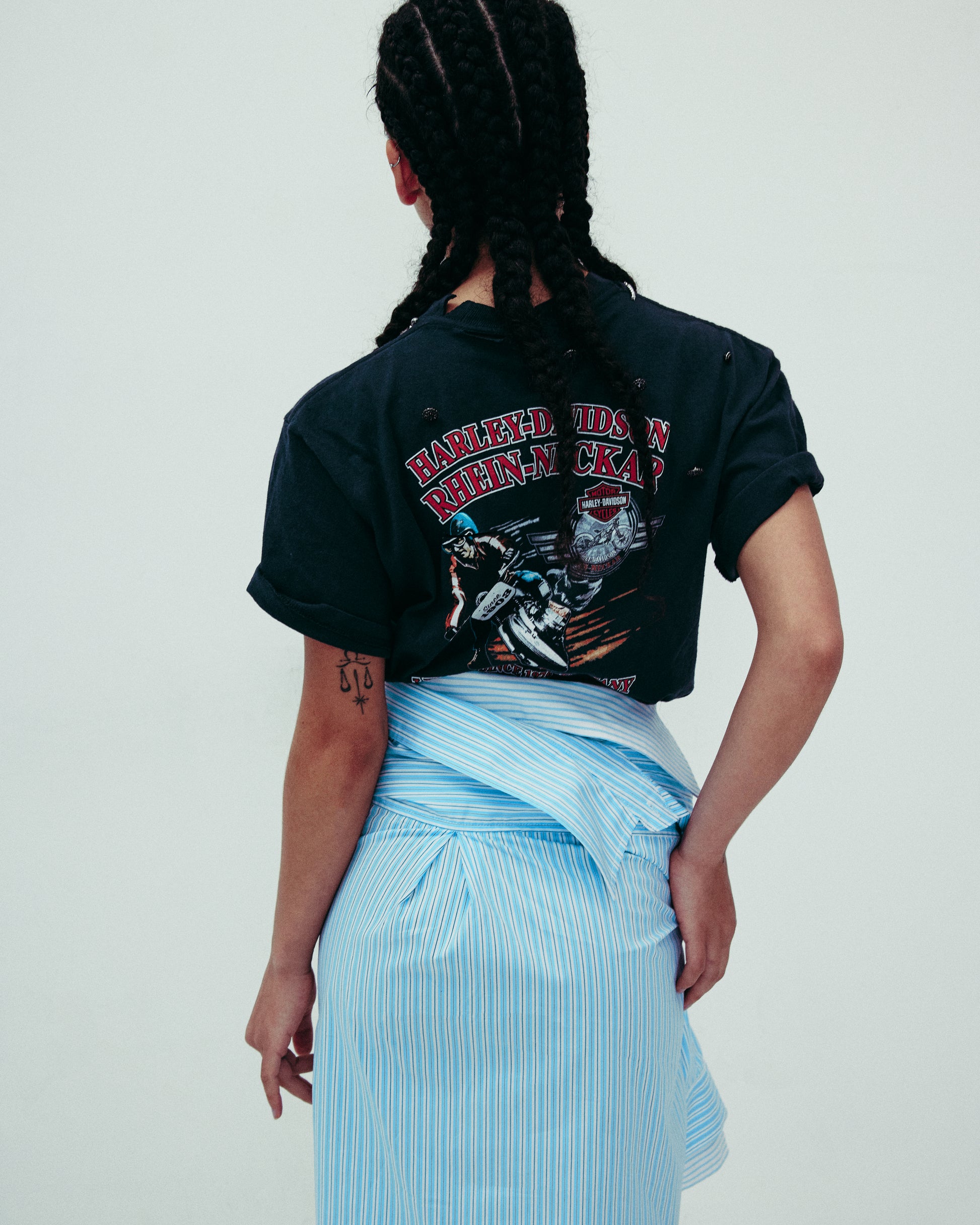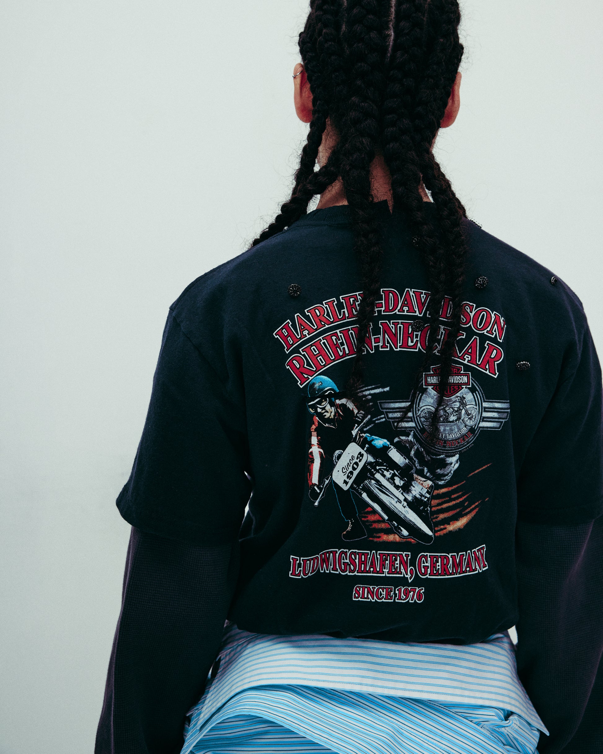 This is a truly one-of-a-kind vintage Harley-Davidson t-shirt, radiating a rebellious and luxurious spirit. Carefully reworked, it showcases unique Swarovski embroidery details that catch the light and elevate the iconic graphic with unexpected sparkle. Adding to its edgy character are intentional ripped details, lending a perfectly worn-in and individualistic feel. For added versatility and a dose of cool contrast, the t-shirt comes with detachable oversized waffle-knit long sleeves, allowing you to transform its look and adapt to different temperatures. This statement piece is a wearable piece of history, infused with high-fashion embellishments and a distinctive, do-it-yourself attitude.